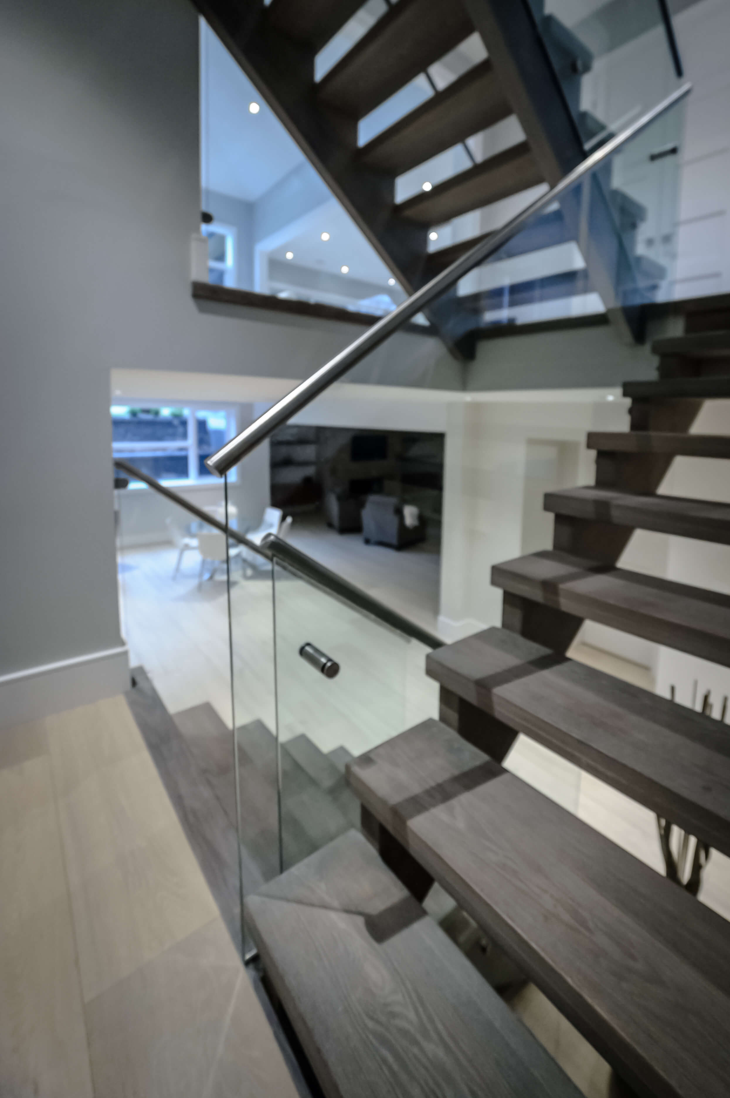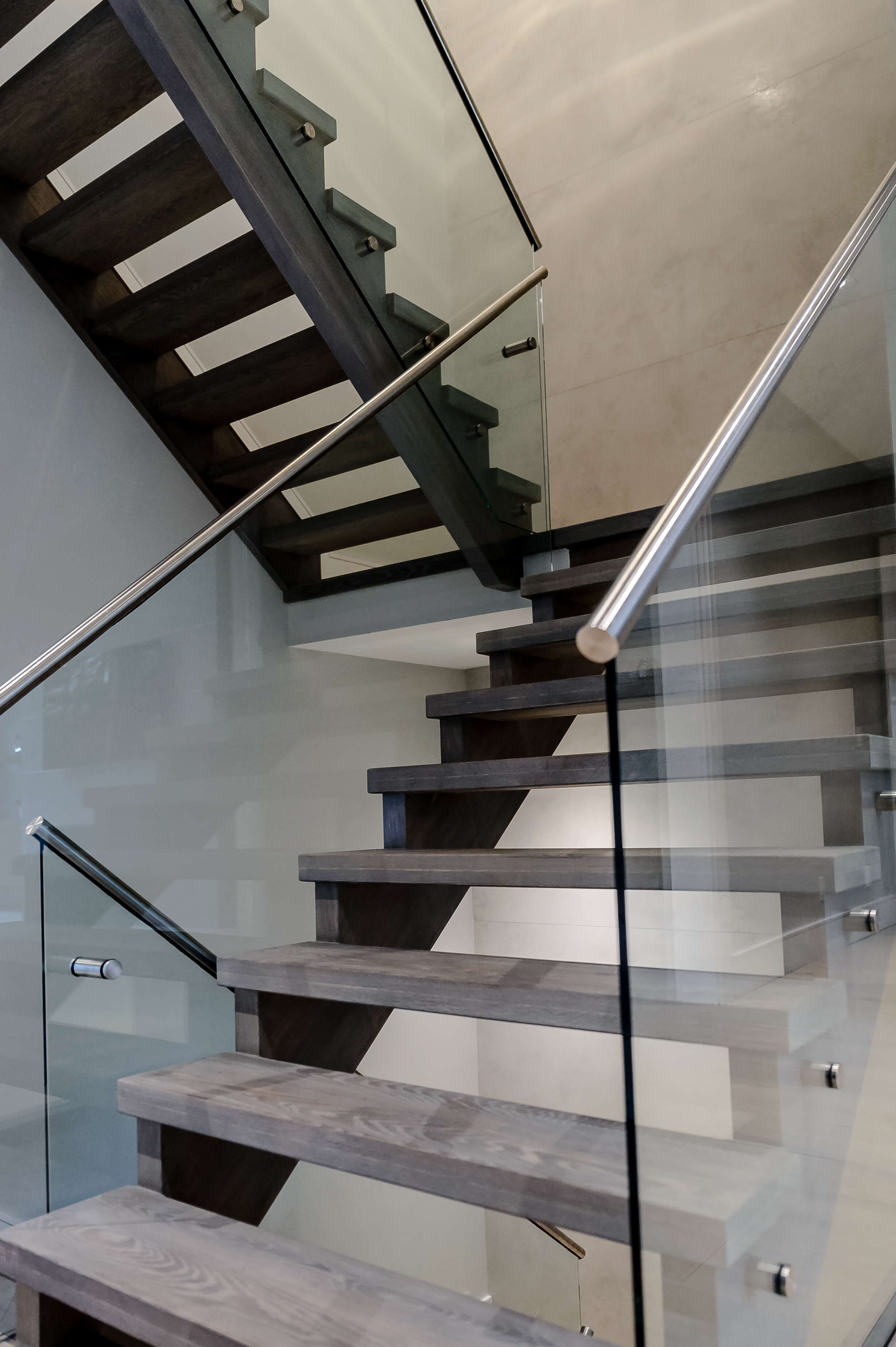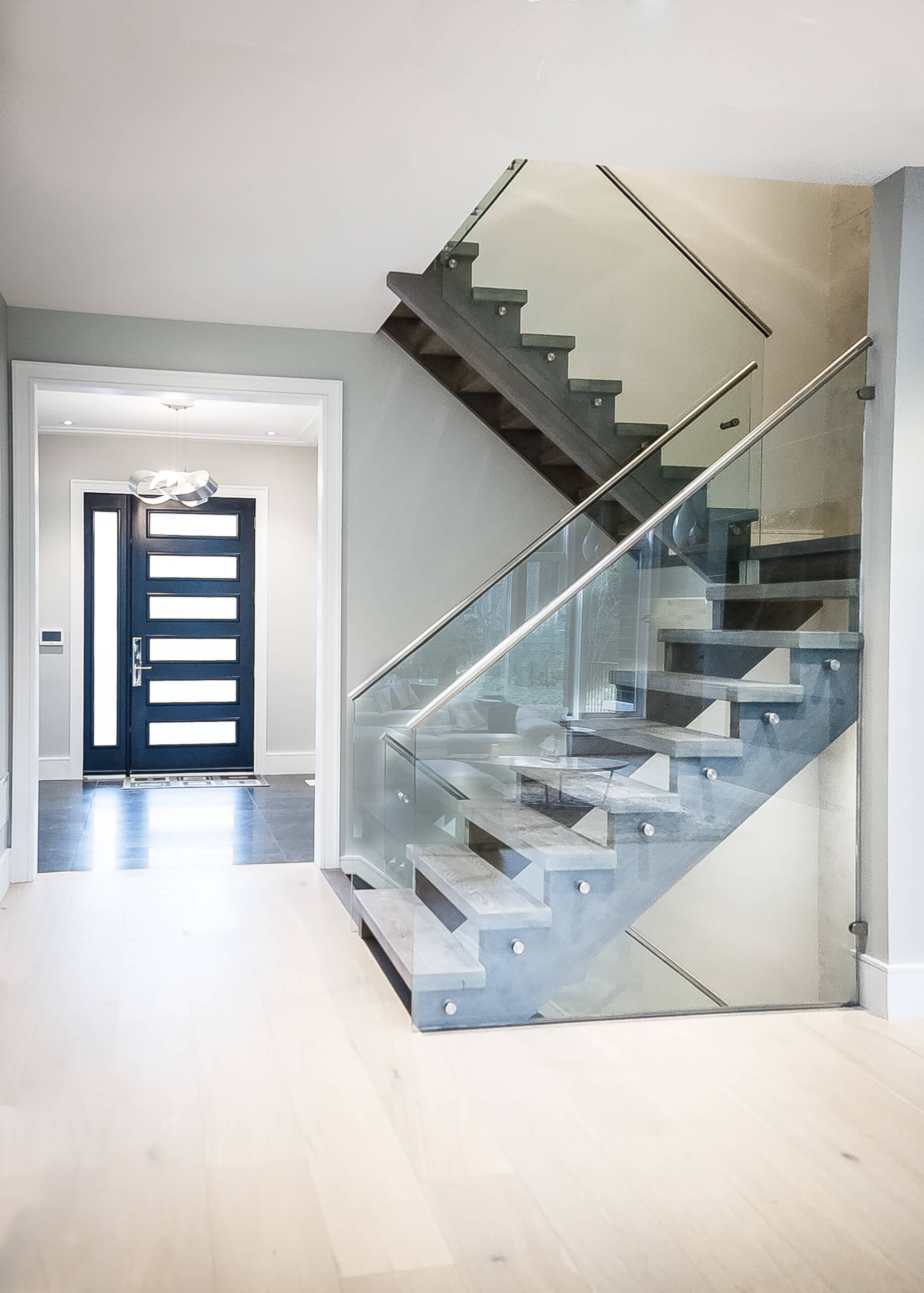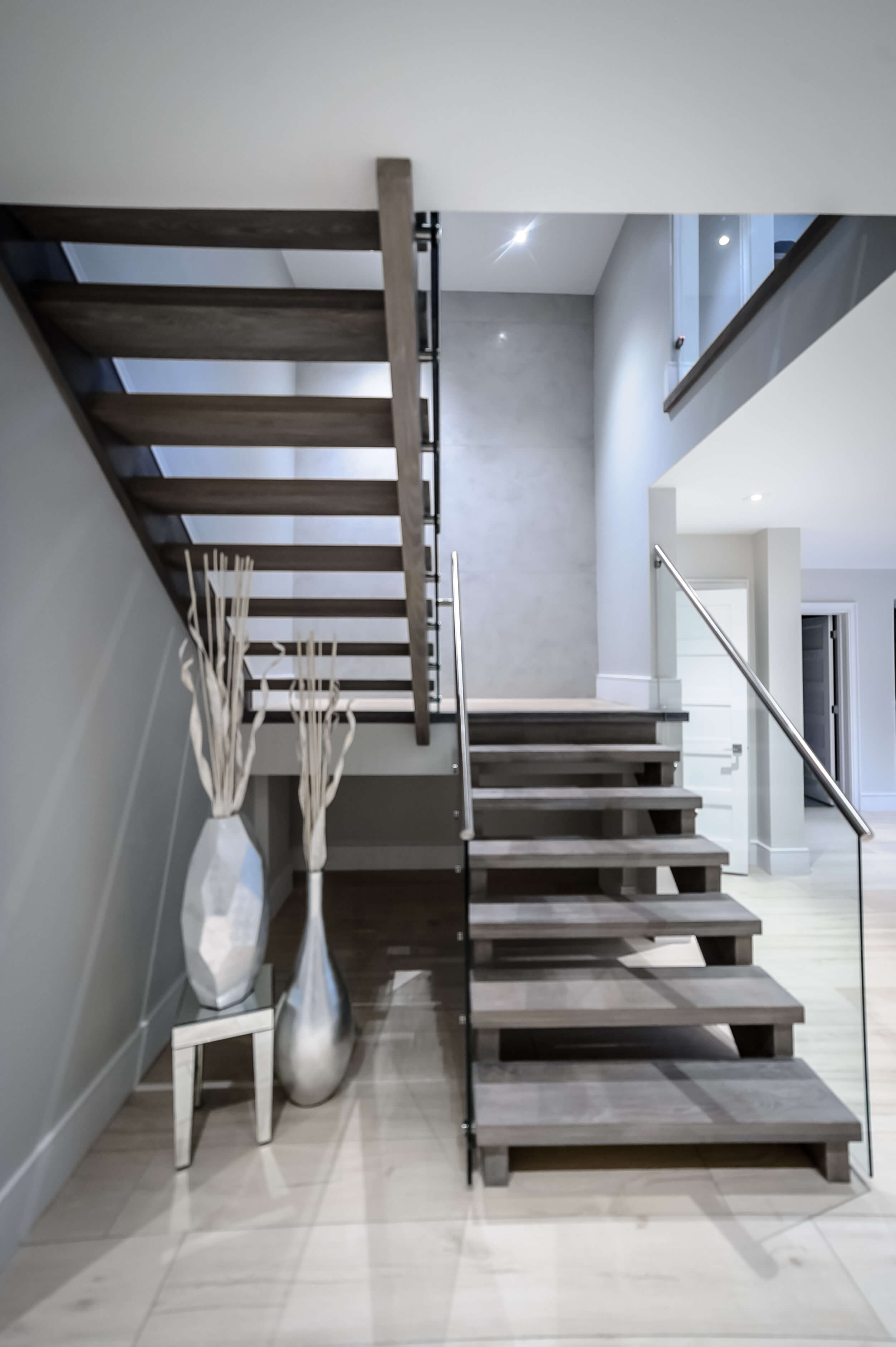 This Oakville home’s central space has the open modern staircase as a main focal point, backed by marble panels that create a luxurious look in an understated, elegant way. The staircase materials extend this feeling into the third dimension with solid oak treads, stainless hardware, and glass railings. assembled and installed to exacting standards.